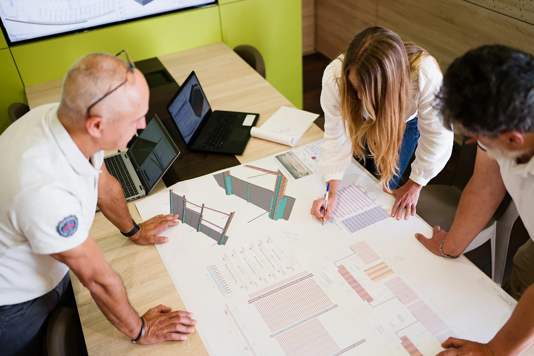 Grâce à la coordination fluide entre nos équipes terrain (conducteurs de travaux, chefs de chantier, poseurs) et nos équipes support (bureau d’études, manufacture),